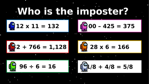 Among Us - Maths | Teaching Resources Among Us - Maths Subject: Mathematics Age range: 7-11 Resource type: Lesson (complete) 2 reviews File previews pptx, 1.49 MB pptx, 4.49 MB pub, 625.5 KB This is an Among Us themed maths lesson I created for my Year 3 class. The Powerpoint introduces the class to the game.